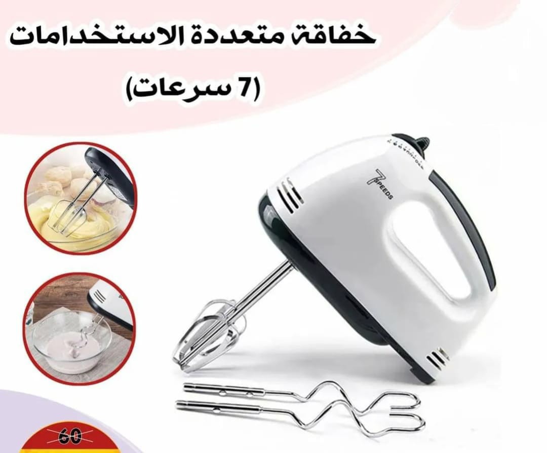 خفاقة كهربائية متعددة السرعات لخفق البيض والكريمة وتحضير الحلويات بسهولة. تحتوي على ملحقات متعددة وتصميم مريح للاستخدام. كلمات بحث: خفاقة، مضرب بيض، خلاط يدوي.
