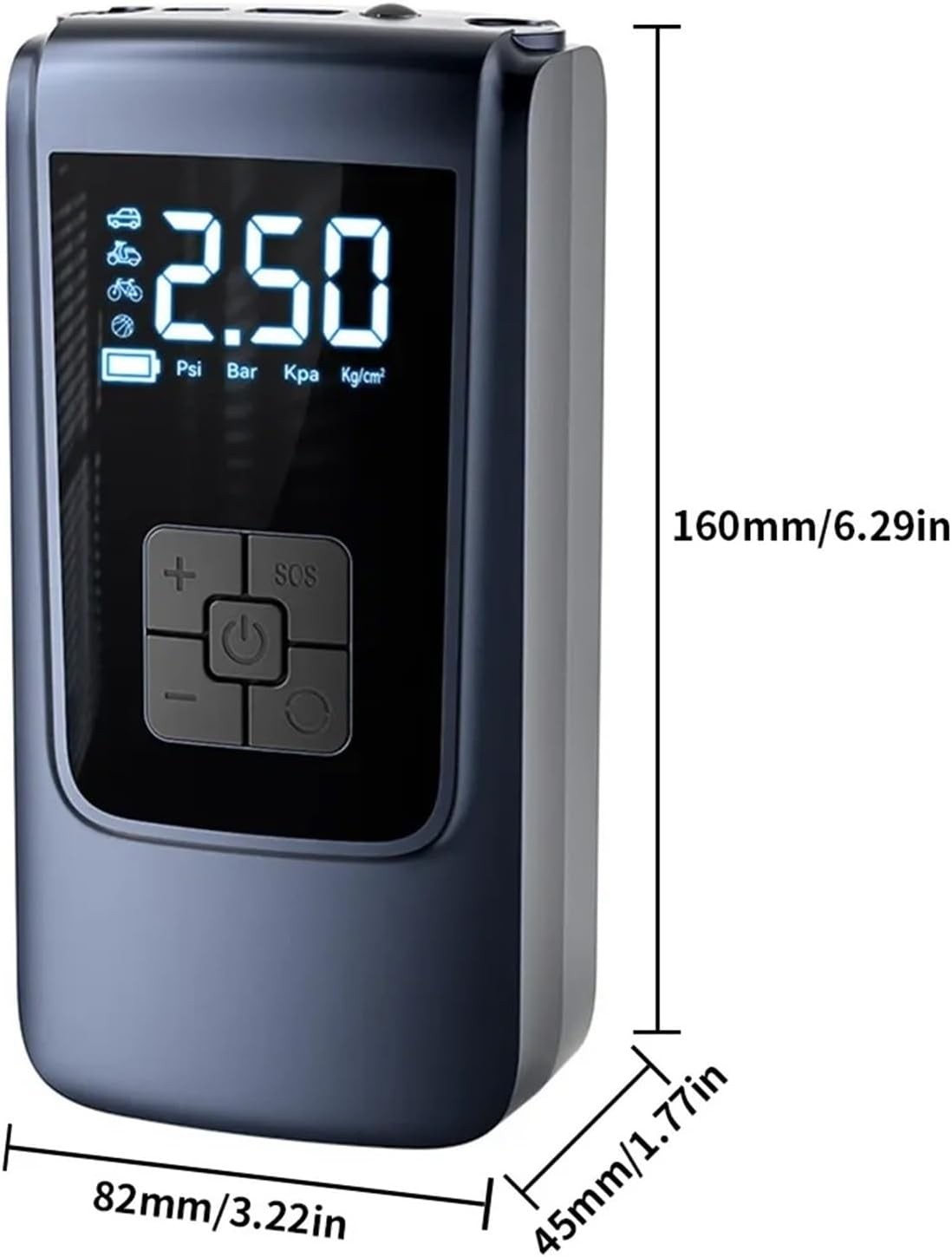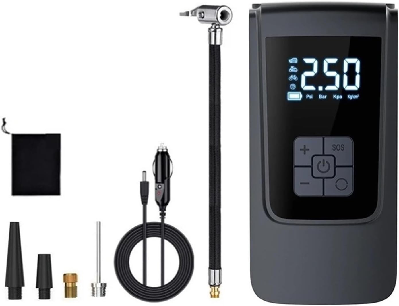 استخدامات متعددة: يمكن استخدامها لتضخيم إطارات السيارات والدراجات النارية، بالإضافة إلى كرات الألعاب، الطوافات، شحن الأجهزة، وتشغيل أضواء السيارة.