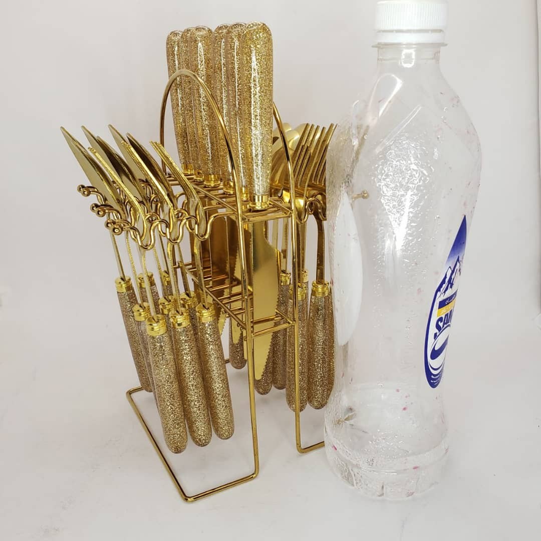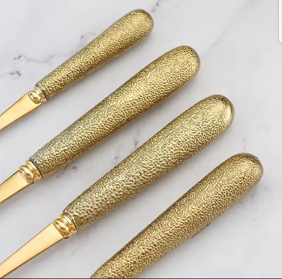 أضيفي لمسة من الأناقة والفخامة إلى مائدتك مع طقم أدوات الطعام الذهبي المميز المكوّن من 24 قطعة.