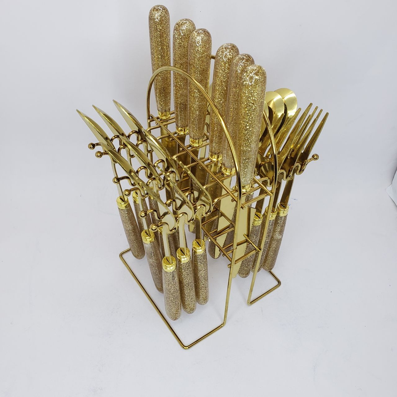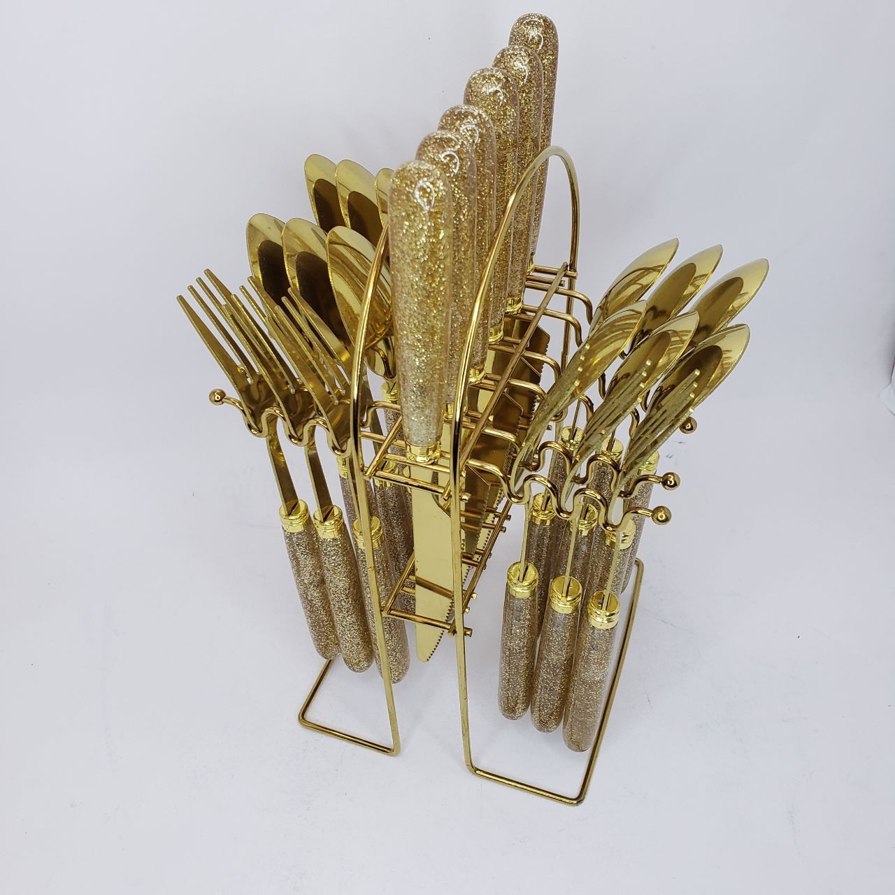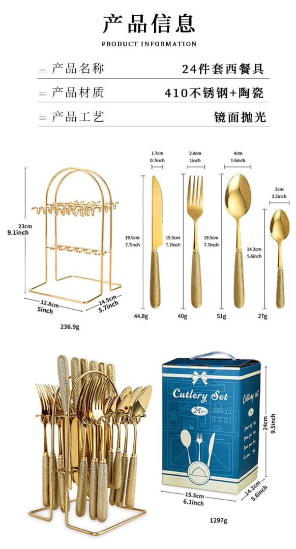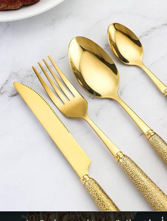 طقم ملاعق وشوك وسكاكين ذهبي 24 قطعة بمقبض سيراميك – ستانلس ستيل فاخر