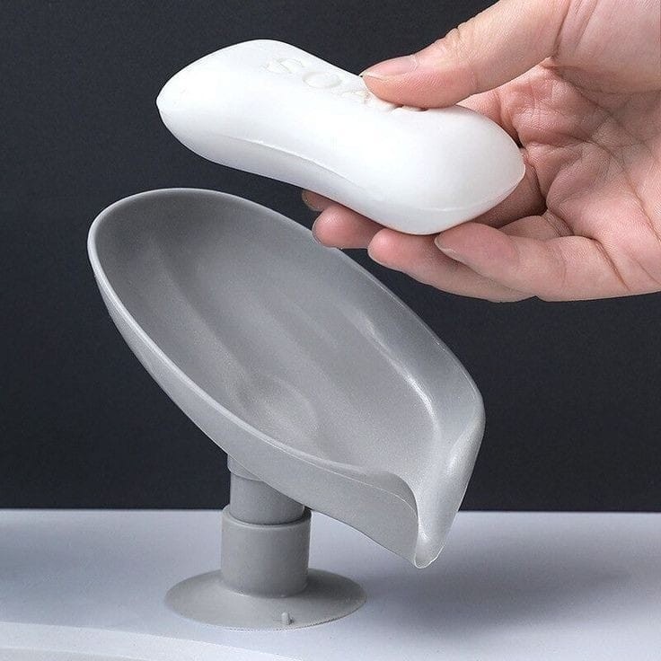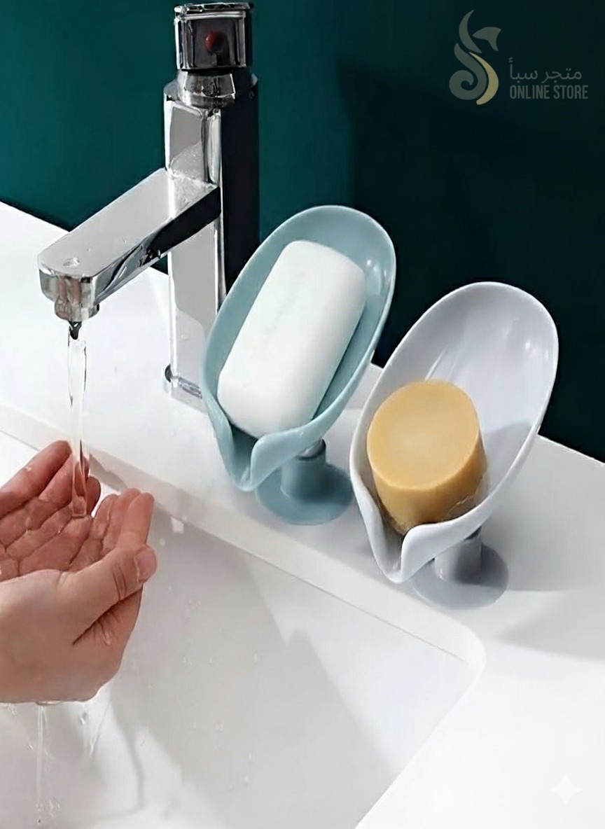 تصميم ذكي يحافظ على الصابون جافًا بفضل تصريف المياه. شكل ورقة شجرة، تركيب لاصق قوي، عبوة من قطعتين.